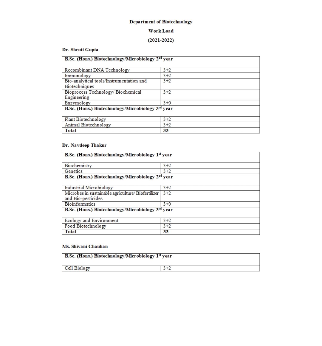 The Department of Biotechnology has a sturdy and dynamic curriculum with well-designed practical classes that fortify the theoretical concepts. Blended teaching practices including group discussions, brain storming, power point presentations, ICT learning, demonstrative lectures, smartboards, guest lectures, assignments etc. are used to make the teaching learning process pleasant. The B.Sc. (Hons.) Biotechnology program provides a firm basis for much of the advanced thinking in the biotechnology discipline. Students are vitalized to perform practicals independently which instils experimentation flair in the early learning process. Students of the department imbibe various DNA and protein based molecular biology techniques, bioinformatics, immunology, biochemistry, biochemical engineering, basic genetic engineering techniques and various techniques in cell biology. The In-house projects conducted within the department, helps students to acquire a research aptitude and hands-on research skills. Entrepreneurships and industrial visits give students a greater understanding of the discipline.