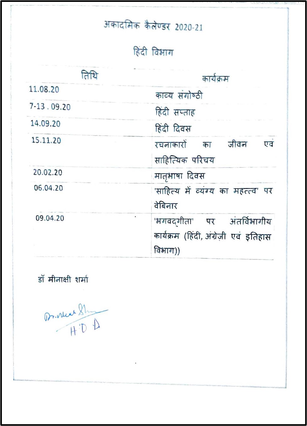 The department of Hindi was established in July 1972. The objective of our department is to make students aware about their mother tongue and to develop excellent proficiency in the Hindi language. Apart from the academic achievements the department engages in various co-curricular activities. The department annually organized Hindi week during Hindi Diwas to highlight the importance of Hindi language. Department of Hindi is committed to enhance student’s ability to communicate effectively.