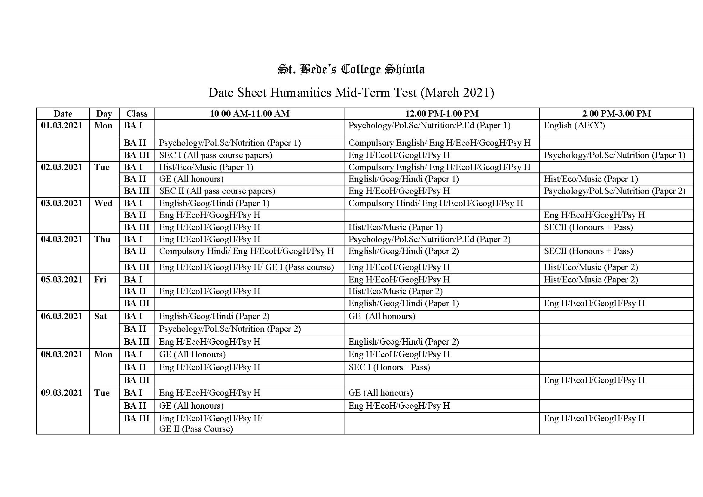 The examination committee functions in accordance with the schedule framed by Himachal Pradesh University for the conduct of final examinations of undergraduate classes.The date-sheet is displayed timely for the information of students. Any clashes/changes reported to the university are notified and displayed to the students. The duty lists are prepared by the committee in consultation with the principal.