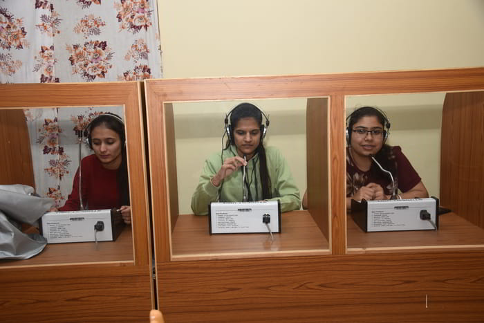 The English language lab plays a vital role in co-curricular activities. It is used for imparting training to students to improve their communicative skills.