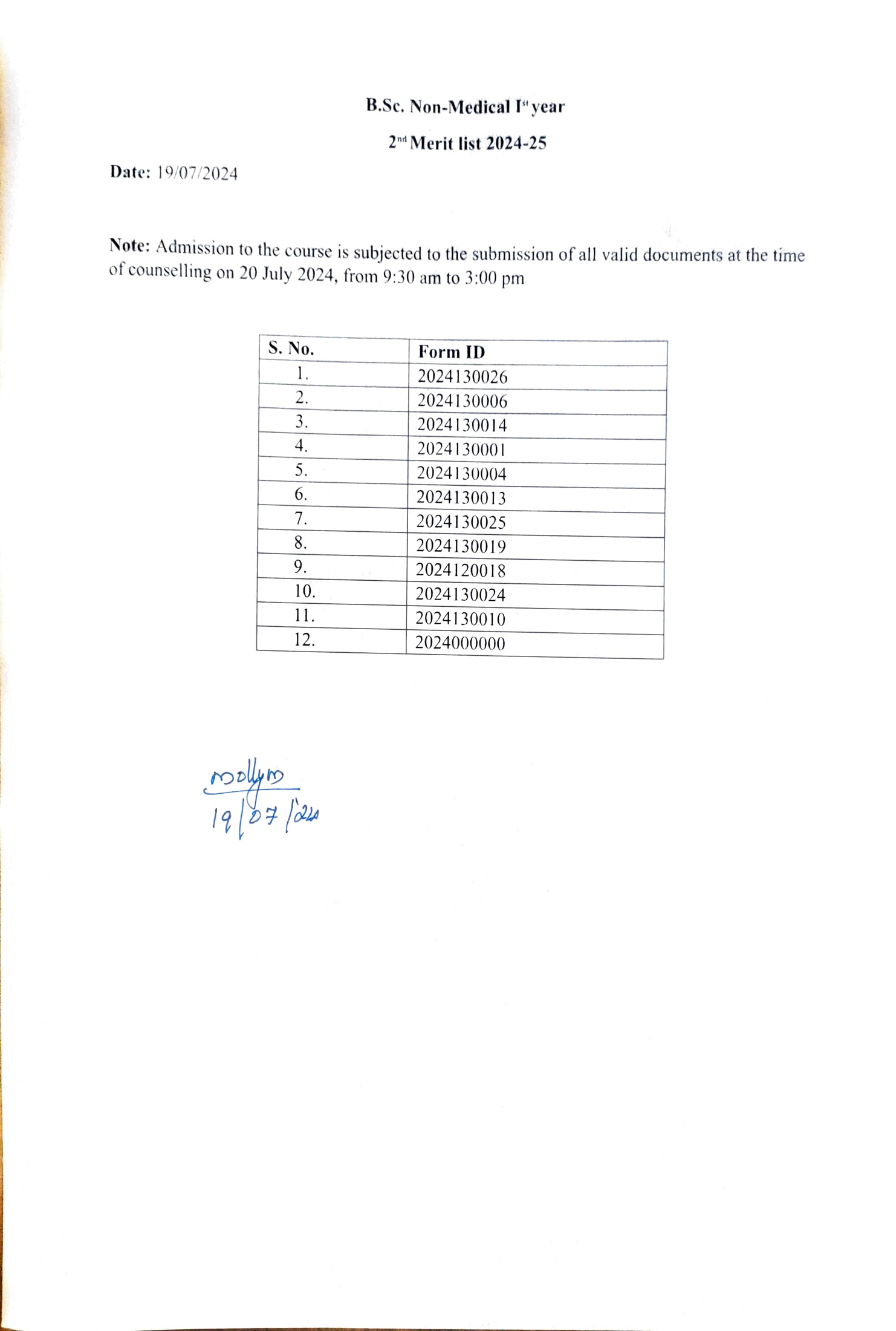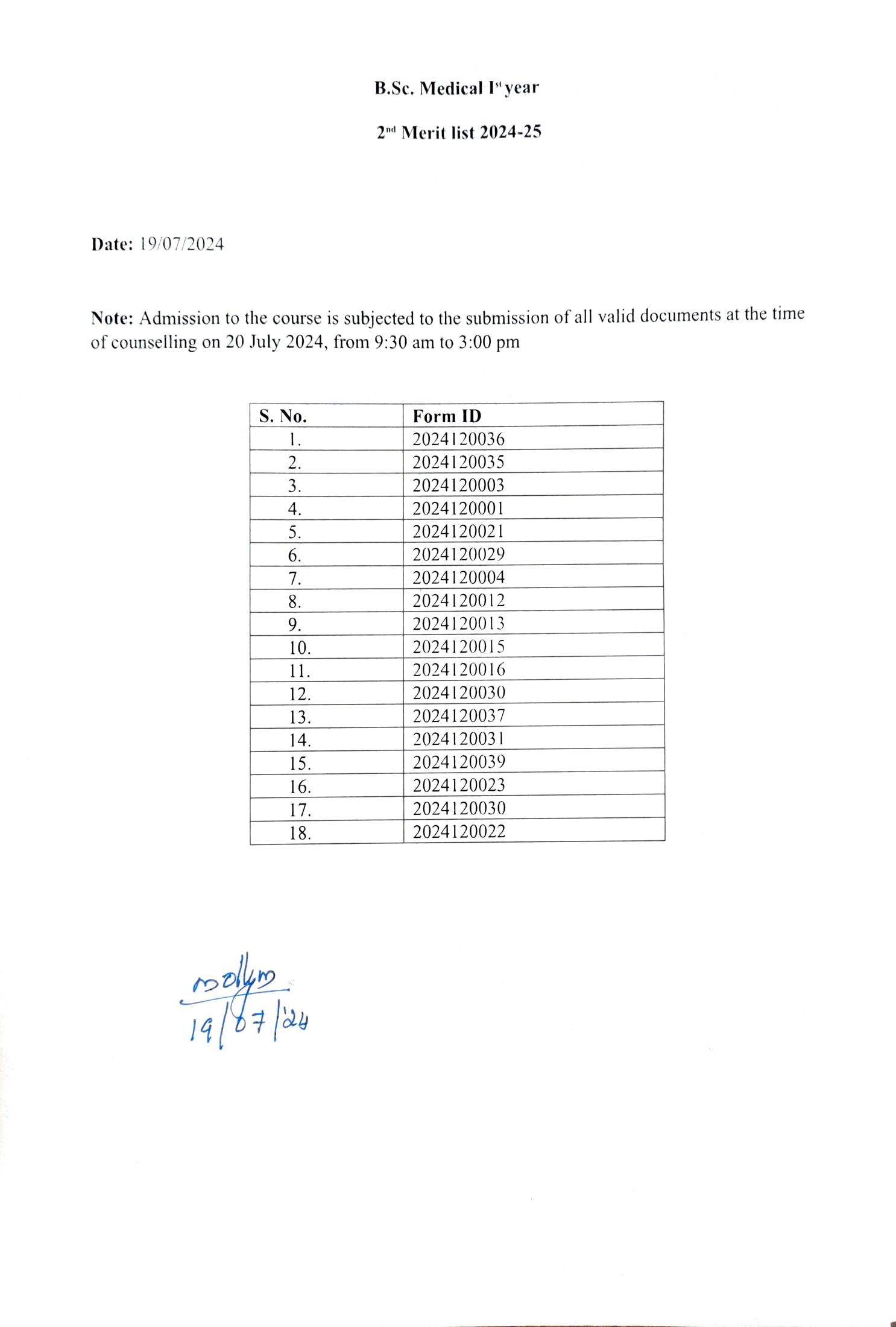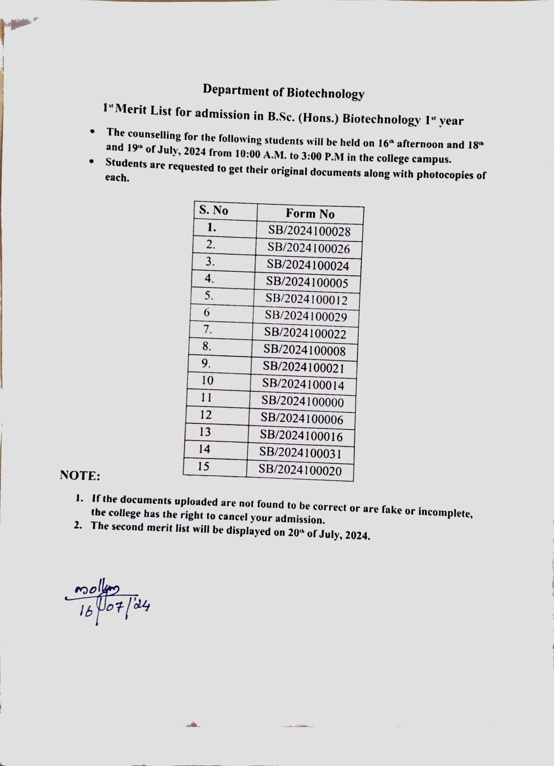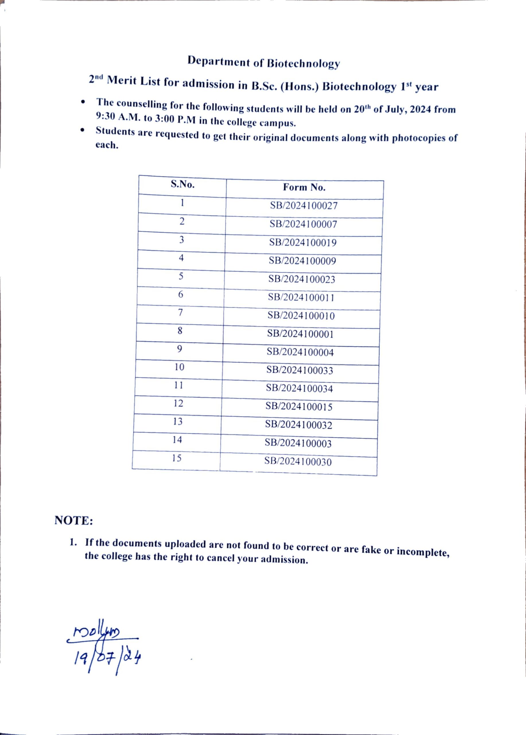 B.Sc. (Hons.) Biotechnology 1st Year Second Merit List(2024-25)